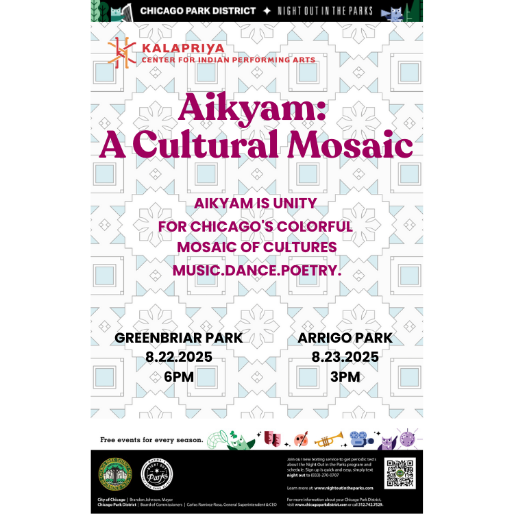 “Aikyam: A Cultural Mosaic” as part of the Chicago Park District’s Night Out in the Parks free summer series.