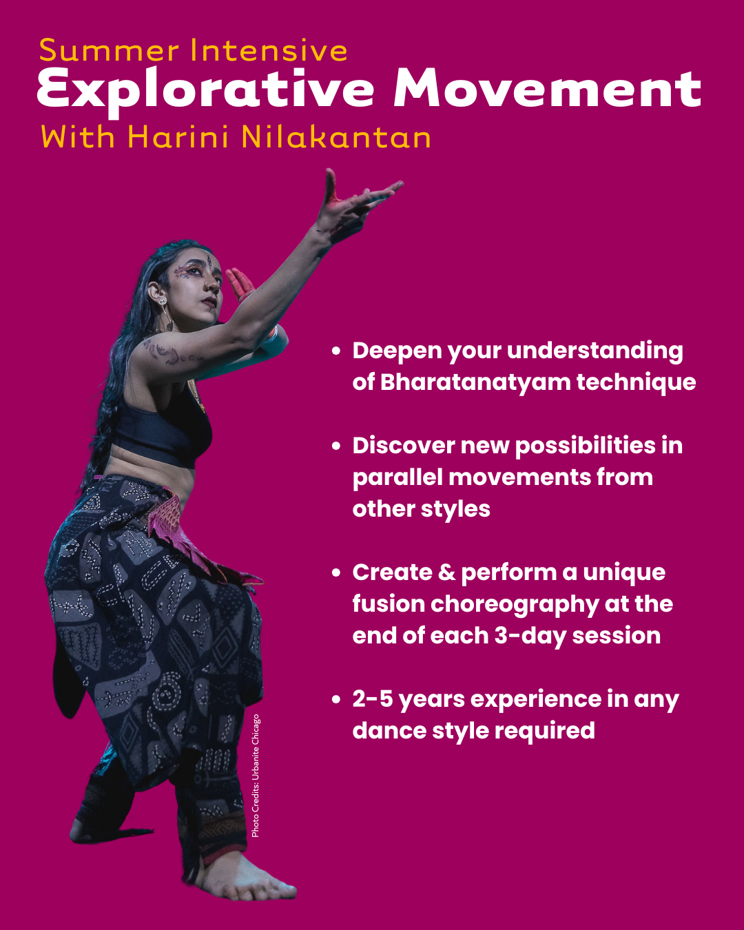 Explorative Movement is an embodied practice technique developed by eminent choreographer and dancer Harini Nilakantan. In this movement-based intensive, participants will deepen their understanding of foundational Bharatanatyam techniques while discovering new possibilities in parallel movements drawn from other non-classical dance styles. Each three-day session will culminate with a filmed piece that showcases each participant's unique integration of these diverse movement styles.